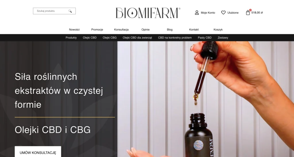 Innym projektem jest sklep.biomi-farm.pl – kompleksowy sklep konopny działający w oparciu o WordPress i WooCommerce. W tym przypadku wdrożenie wymagało nie tylko dobrego UX, ale też pełnej integracji z systemem lojalnościowym, rabatowym i marketingowym. Dodatkowo zadbałem o pełne przygotowanie pod pozycjonowanie, wdrożenie polityk zgodnych z RODO i konfigurację wszystkich wymaganych narzędzi analitycznych. Sklep był gotowy do działania w dwa tygodnie, a dziś obsługuje X (😉) zamówień miesięcznie.